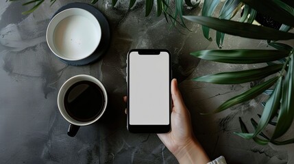 Close-up of a woman's hand holding a phone with a blank screen, on a gray concrete table background, with a cup of coffee on the side, in a light beige and dark blue aesthetic style.