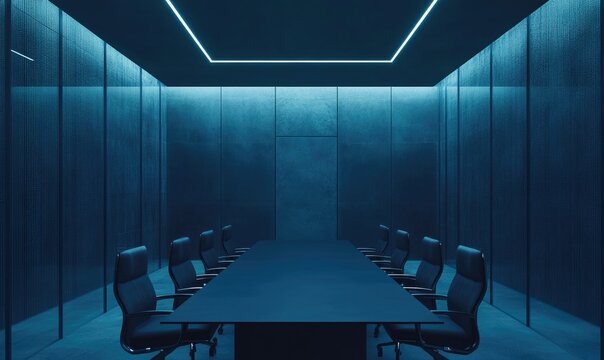 Server racks depicted in dimly lit data center security room with dark blue aesthetic