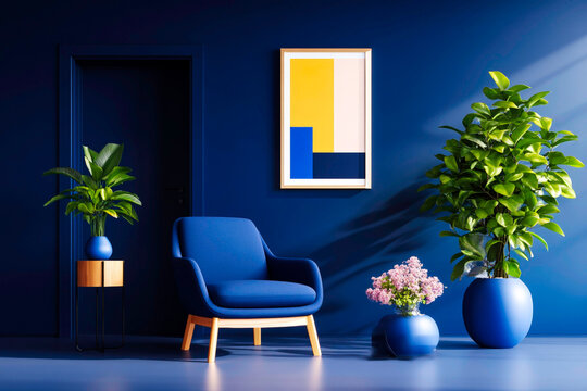 Displaying minimalist light wood table with dark blue pen against deep blue wall