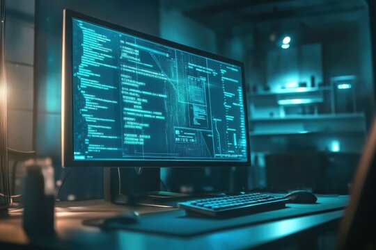 Glowing red terminal code on dark monitor at cybersecurity workstation