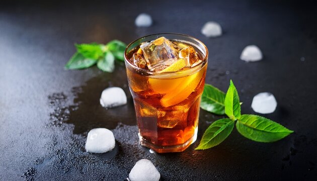 Cola splashing with ice cube in glass, mid-splash droplets and condensation