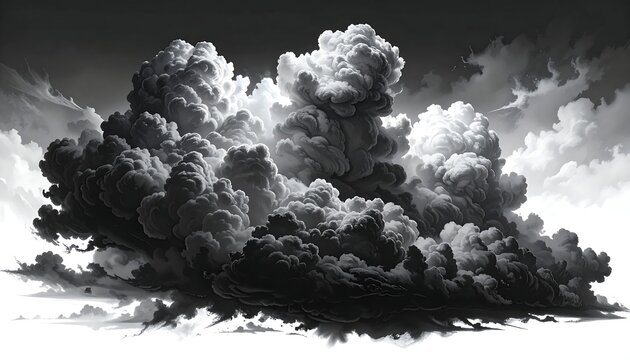 Monochromatic depiction of a massive, cumulus cloud formation, rendered with detailed shading and texture, filling most of the frame