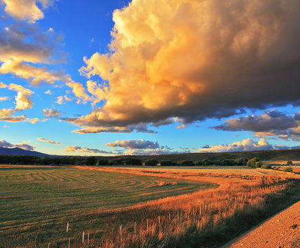 Golden sunset sun rays illuminating fluffy cumulus clouds