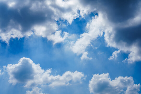 Dramatic sunlight rays shining through cumulus clouds on clear blue sky