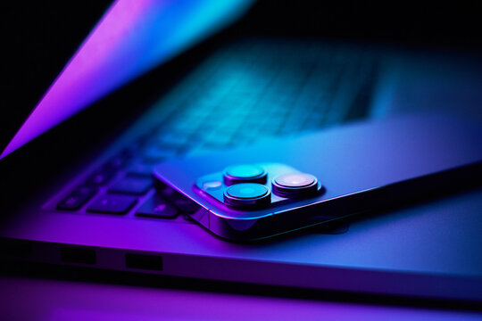 Modern plate pedestal of neon platform display with luxury stand podium on dark room background. Blank Exhibition or empty product shelf. 3D rendering