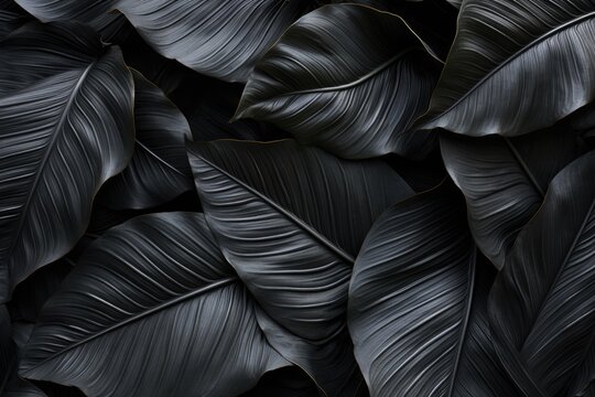 A highly detailed close-up of a bunch of black leaves, showcasing their unique texture and intricate patterns, Textures of abstract black leaves for tropical leaf background, AI Generated