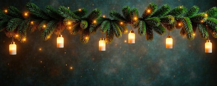 Hanging evergreen garland adorned with sparkling fairy lights and white lanterns, candles lighting up branches, decorative evergreen garlands, dark green branches