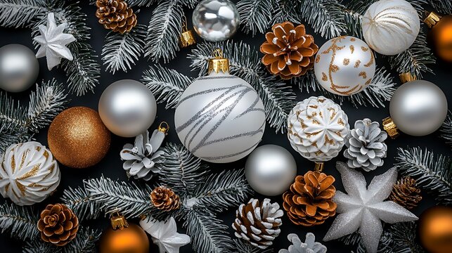 Elegant Silver and Gold Christmas Ornaments on Dark Green Branches AI Generated