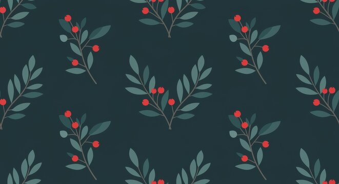 Seamless Pattern of Dark Green Branches with Red Berries background floral