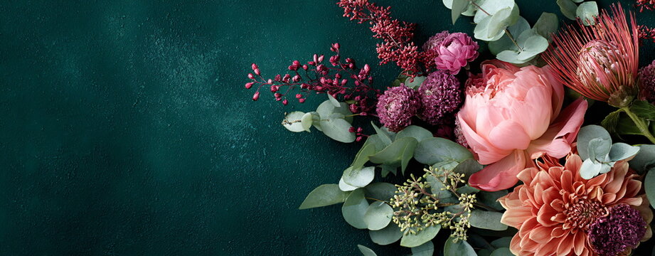 Autumn floral bouquet with dahlia, peony and vine leaves on a dark green textured surface, providing a place for text. Elegant design for a postcard or banner.