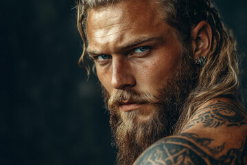 Blonde haired viking with braided beard and tattoos looks intensely over his shoulder