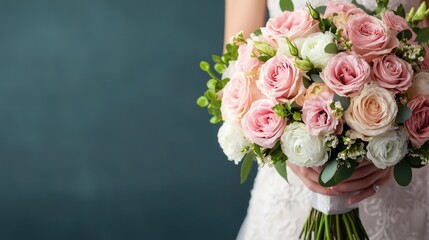 Bride holding a beautiful bouquet of pink and white roses against a dark green background, perfect for wedding themes.