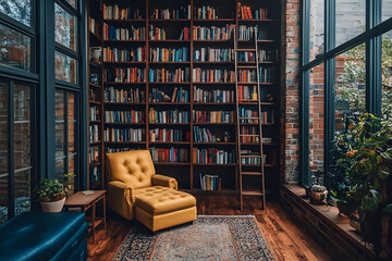 A dark academia home library with floor-to-ceiling bookshelves and a rolling ladder.