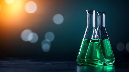 Three glass beakers filled with green liquid stand on a dark surface, illuminated by soft bokeh lights.  AI generated