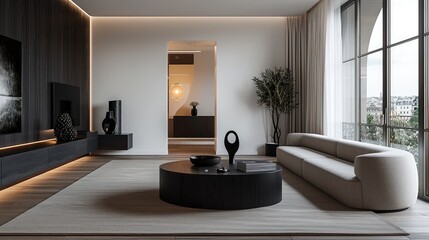 Modern, sleek, large, living room, sideboard with a combination of dark black oak veneer and matte lacquer finish.