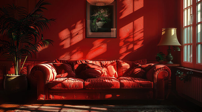 Dark red interior environment. living room. Generative AI.