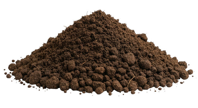 Earthy mound of dark soil, texture visible, isolated on black background