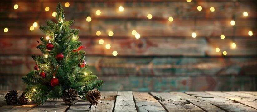 Festive Christmas theme with a beautifully decorated tree on a wooden table, providing a perfect background for the copy space image.