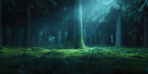 A close-up view of a misty evergreen forest featuring ancient tall pine and fir tree trunks, with moss covering the ground and light filtering through the trees in a dark atmosphere