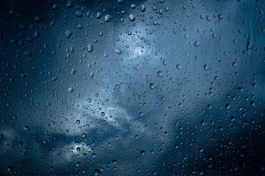 Stormy sky through rain-covered glass window