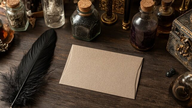 Vintage apothecary scene with blank kraft paper card, dark feather, and antique glass bottles creating a mysterious alchemical workspace atmosphere
