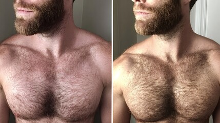 Man shirtless showing close up comparison of upper torso with lighter skin on one side and darker tan on the other, highlighting before and after sun exposure and skin tone change