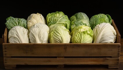 A rustic wooden crate filled with various types of cabbages, including pale green, white, and darker green heads, displayed against a black background