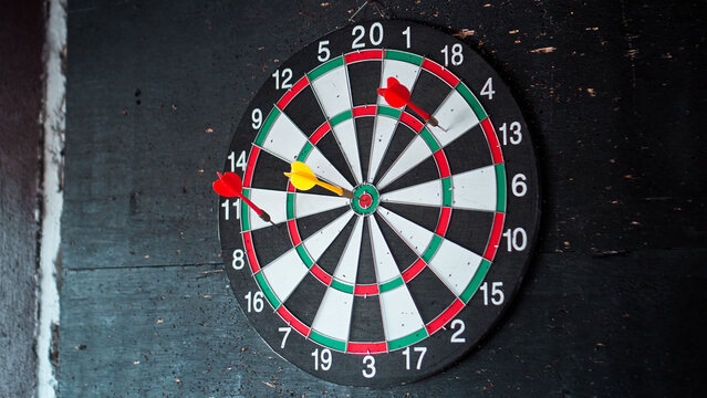 Darts. The dart for playing in the game board is stuck. Hit sector in darts. The concept of a successful strategy.