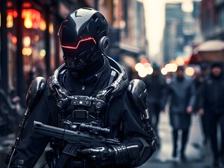 A mysterious figure, dressed in a black cloak and armed with a powerful weapon, stands defiantly on the deserted street, evoking a sense of fear and intrigue reminiscent of the iconic darth vader
