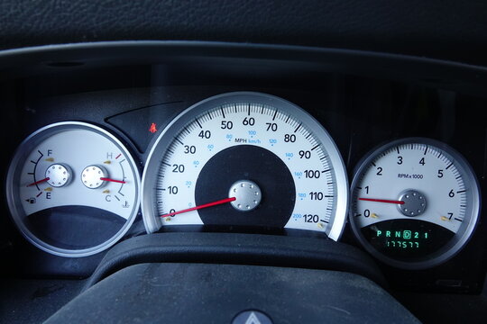 The dash,dashboard instruments and display,a speedometer,odometer of a sports car.