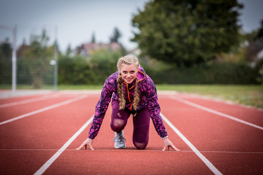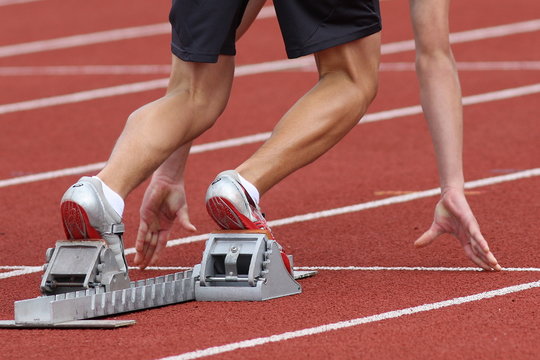 Swimmer preparing dive on starting block with coach and performance analytics overlay