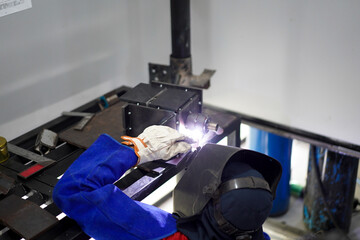 Welder performing Tungsten Inert Gas welding process (TIG) on stainless steel. TIG welding uses the heat generated by an electric arc struck between a non-consumable tungsten electrode and the work