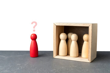 A minimalistic scene with five wooden figurines. Four natural wood-colored figurines stand in a row inside a dashed rectangular box