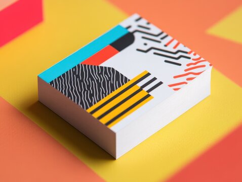 A stack of cards displays a vibrant geometric pattern with bold lines and shapes.