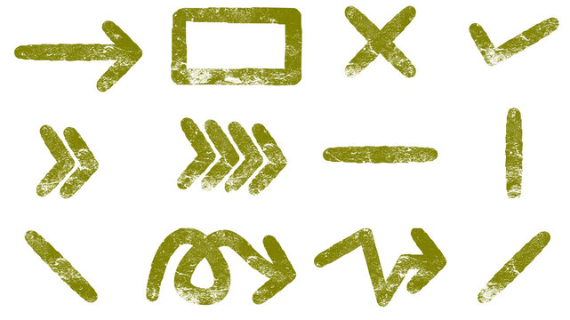 A collection of hand-drawn olive green grunge style icons, including various arrows, a checkmark, a cross, and other symbols on a white background.