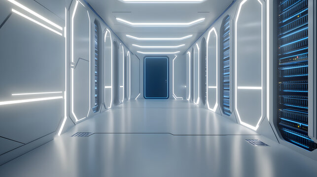 Futuristic data center corridor with illuminated server cabinets