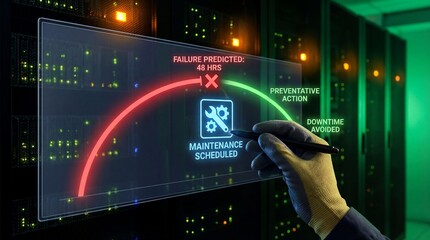 A hand interacting with a futuristic digital screen displaying maintenance schedules and predictions