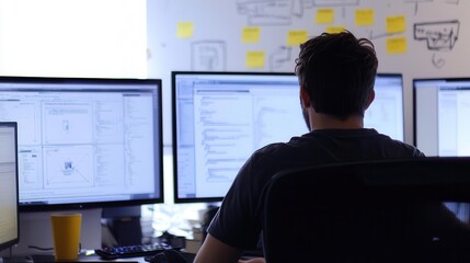 A person working at a desk with multiple computer screens and sticky notes.