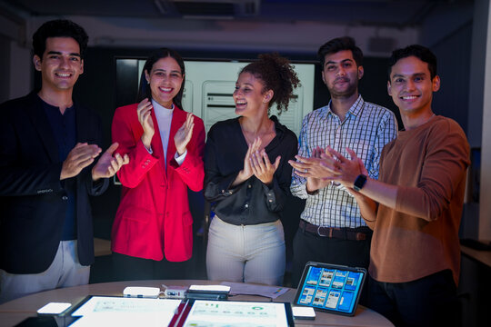 Professional software development team applauding for project success. Happy diverse group clapping hands to celebrate mobile app launch in high-tech startup office.