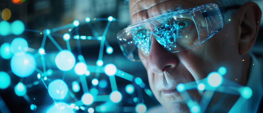 Man with safety glasses observes a holographic molecular structure, symbolizing advanced research
