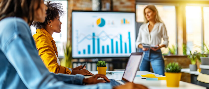 Business meeting presentation with team collaboration and data analysis