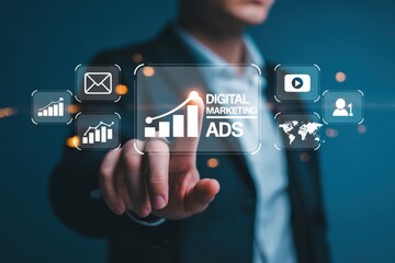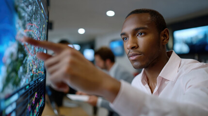 A focused professional interacts with a digital display, highlighting data-driven insights. The image reflects advanced technology in a modern workspace environment.