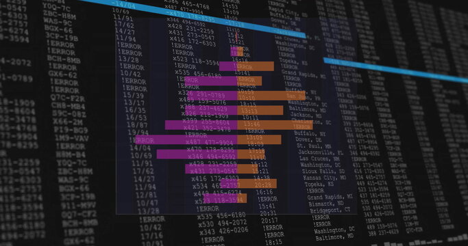Financial data processing over black background with error messages