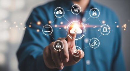A man touches an AI brain icon on a virtual screen for digital wallet payment and e-commerce, representing the future of fintech innovation and secure online transactions in a modern setting.
