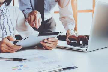 Two colleagues discussing data with tablet and new modern computer laptop on desk table. Close up business team analysis and strategy concept.