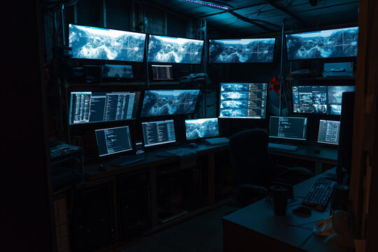 High Tech Command Center with Multiple Monitors and Advanced Computer Equipment