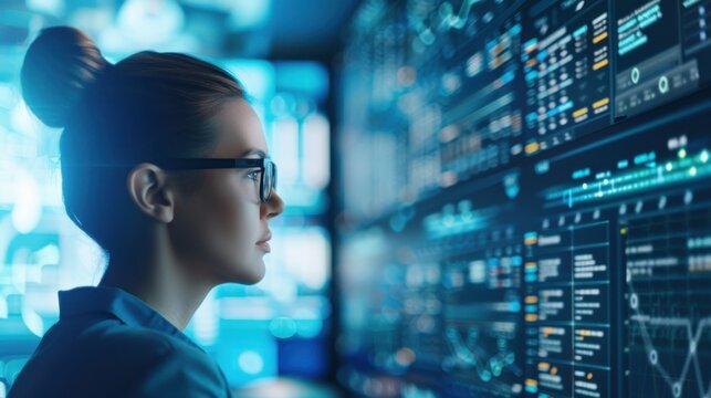 Project manager monitoring network traffic in a high tech control room, analyzing multiple large data screens featuring an advanced user interface for enhanced decision making
