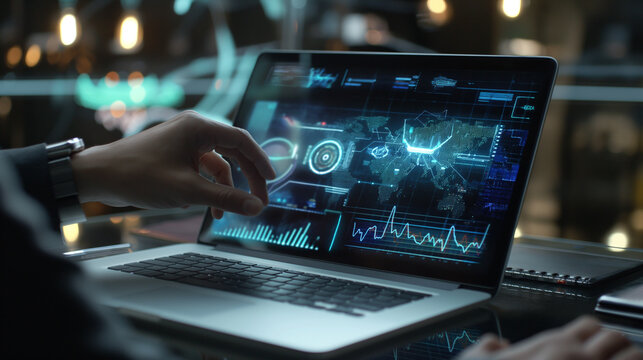 person's hand is holding a stylus over a laptop screen displaying various colorful data analytics and graphs.