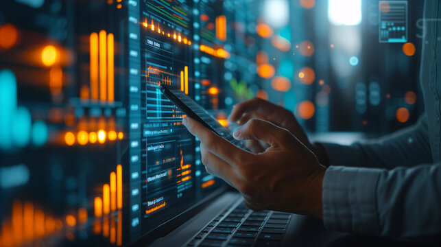 A technology professional closely monitors server data on a smartphone, interacting with a network operations center interface.