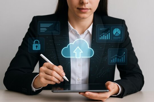 Businesswoman using tablet with stylus and cloud computing technology interface icons, including data upload and cybersecurity graphics overlayed. Ai generative
